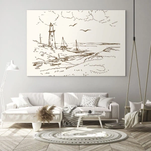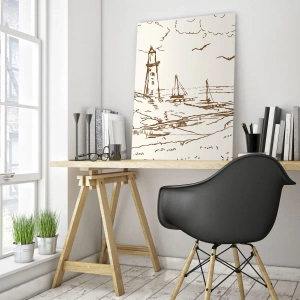 - Une esquisse artistique représentant un phare sur la côte, avec des oiseaux et des voiliers flottant sur l'eau. Les lignes délicates et la forme minimaliste confèrent à la composition une atmosphère élégante et sereine. Une décoration parfaite pour les...