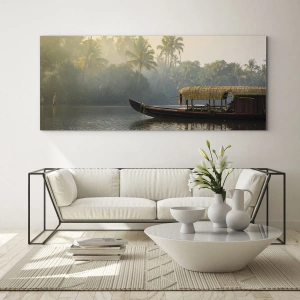 Impression sur verre - Image sur verre - Un bateau sur une rivière calme entourée de palmiers le matin - 50x70cm - Maison sur la rivière - Décoration murale moderne pour le salon et la chambre ARTTOR