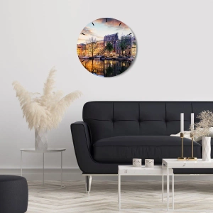 - Cette horloge murale présente une vue pittoresque d'immeubles et du canal au coucher du soleil. Une élégante touche décorative pour les intérieurs modernes.