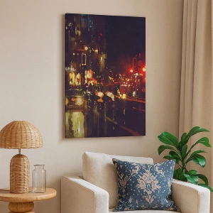 - Le tableau représente une scène urbaine nocturne, agrémentée de lumières colorées et de reflets sur la rue. Cette composition dynamique, pleine d'énergie et d'une atmosphère moderne, s'intègre parfaitement aux intérieurs urbains et élégants.