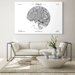 Le tableau « Anatomie d'Oslo » présente la capitale norvégienne dans une interprétation moderne et artistique. Le point central de la composition est une carte détaillée de la ville, présentée en noir et blanc, qui souligne son caractère minimaliste. Ce motif s'intègre parfaitement à l'esthétique des intérieurs scandinaves et modernes. Grâce à la simplicité de sa forme et à l'absence d'éléments graphiques superflus, la carte attire l'attention par sa pureté visuelle. Oslo, motif principal, confère une signification émotionnelle à l'œuvre : c'est un hommage à la culture nordique, à l'organisation spatiale et à l'urbanisme moderne.