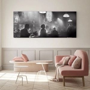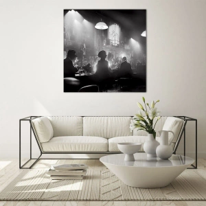 Tableau sur verre « Ambiance jazz » est une image unique d'une soirée passée dans un club de musique d'ambiance. Il représente une scène en noir et blanc, au centre de laquelle se déroule un concert de jazz, entouré d'un public baigné par les sons d'un saxophone et d'une contrebasse. Les jeux de lumière, la fumée de cigarette et les silhouettes élégamment vêtues créent une atmosphère mystérieuse et élégante.