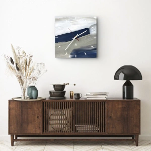 - Cette horloge murale de 30 x 30 cm présente une composition abstraite aux tons blanc et bleu marine. Des coups de pinceau minimalistes créent un motif contrasté et moderne.