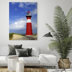 - Vue pittoresque d'un phare rouge niché sur une plage de sable, sur fond de ciel bleu parsemé de nuages délicats. Ce tableau apporte une atmosphère balnéaire et une harmonie estivale à tout intérieur.