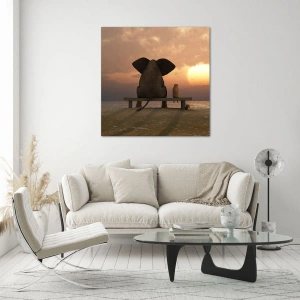 Impression sur verre - Image sur verre - Éléphant et chien sur un banc au coucher du soleil - 50x70cm - C'est bon de garder le silence ensemble - Décoration murale moderne pour le salon et la chambre ARTTOR