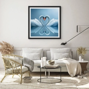 - Cette affiche représente deux cygnes formant un cœur sur une eau calme, sur fond bleu. Parfaite pour un intérieur romantique et élégant. Ce produit est livré avec un cadre noir de 50 x 70 cm.