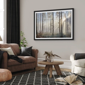 Affiche dans un cadre noir - Poster - Un matin brumeux dans la forêt avec des rayons de soleil - 50x70cm - Le brouillard s'est aussi réveillé - Décoration murale moderne pour le salon et la chambre ARTTOR
