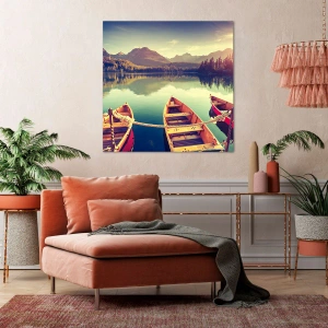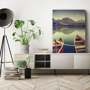• Un tableau représentant des bateaux sur un lac calme entouré de montagnes, parfait pour les intérieurs qui valorisent l'harmonie et la beauté de la nature.