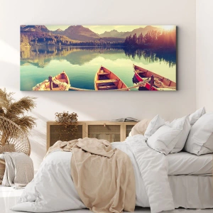 Décoration murale - Vivre selon ses lois - Bateaux sur un lac calme entouré de montagnes au coucher du soleil