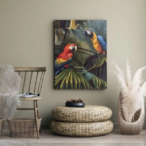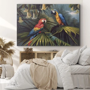 Impression sur toile - Image sur toile - Perroquets dans une forêt tropicale avec des fleurs exotiques en arrière-plan - 50x70cm - Romantisme dans les tropiques - Décoration murale moderne pour le salon et la chambre ARTTOR