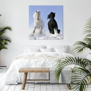 • Un tableau représentant un cheval noir et blanc galopant dans la neige. Symbole de force, de liberté et d'harmonie, il s'intègre parfaitement aux intérieurs élégants et classiques.