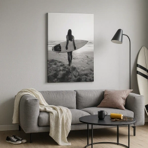 - Ce tableau en noir et blanc représente une femme avec une planche de surf sur une plage. Une composition élégante et minimaliste, parfaite pour les intérieurs modernes inspirés par la nature et le mouvement.