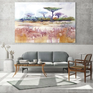 Peinture murale « Couleurs de la savane » - Paysage de savane à l'aquarelle avec arbres et végétation