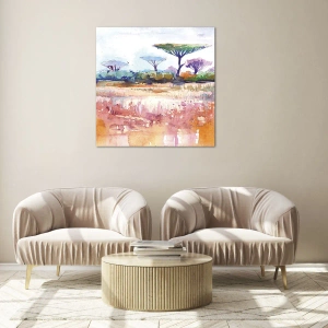 - Ce tableau représente un paysage de savane à l'aquarelle, avec des arbres et une végétation aux couleurs chaudes. L'œuvre est réalisée sur verre.