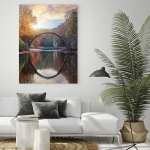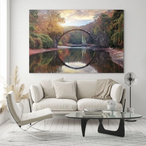 - Un pittoresque pont de pierre, formant un cercle parfait, se reflète dans la surface du lac, entouré d'une forêt automnale. Un paysage paisible, idéal pour un salon ou une chambre. Cette peinture sur verre ARTTOR mesure 70 x 50 cm et est présentée hori...