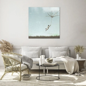 Impression sur verre - Image sur verre - Une silhouette soulevée par une grosse graine de pissenlit - 70x100cm - Cerfs-volants, pissenlits, vent - Décoration murale moderne pour le salon et la chambre ARTTOR