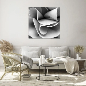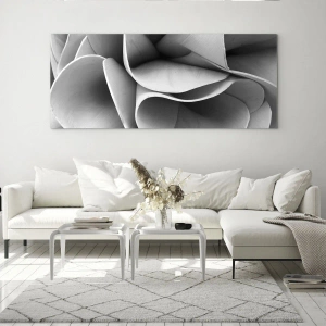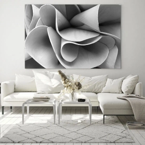 - Une composition artistique en noir et blanc représentant des formes spirales et pétales. Ce détail abstrait, dans un cadre minimaliste, est idéal pour les intérieurs modernes et spacieux, de style loft ou industriel.