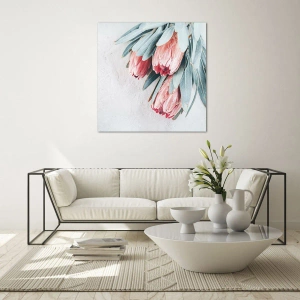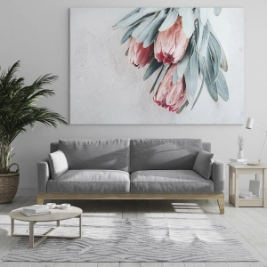 Impression sur verre - Image sur verre - Trois fleurs de protéa pastel avec des feuilles sur un fond clair - 100x70cm - Honte de leur propre beauté - Décoration murale moderne pour le salon et la chambre ARTTOR