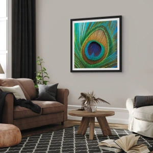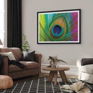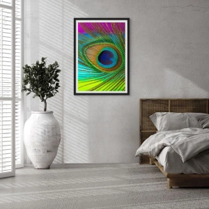 Affiche dans un cadre noir - Poster - Gros plan d'une plume de paon aux couleurs vives - 70x50cm - Les yeux dans les yeux - Décoration murale moderne pour le salon et la chambre ARTTOR