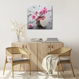- Une horloge murale ornée d'un motif de fleurs de cerisier roses sur une branche, disposées à côté de pierres décoratives aux couleurs pastel. Parfaite pour les intérieurs zen et les compositions minimalistes.