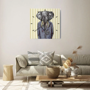 Horloge murale - Élégante par nature - Dessin élégant d'un éléphant en costume sur fond de rayures verticales