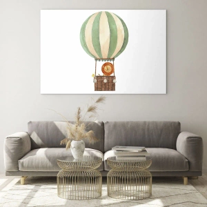 Impression sur verre - Image sur verre - Un lion dans un panier de ballons flottant sur un fond blanc - 50x70cm - Les voyages de Léon - Décoration murale moderne pour le salon et la chambre ARTTOR