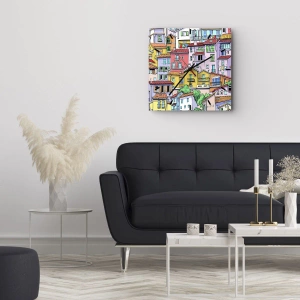 L'horloge murale « Happy City » allie fonctionnalité et esthétique joyeuse et illustrative. Au centre de la composition se trouve un graphisme dynamique représentant des immeubles colorés, disposés en cascade, typique des villes méditerranéennes. Le cadran présente des bâtiments aux couleurs intenses comme le jaune, le rouge, le rose, le bleu et le vert. L'ensemble évoque des souvenirs de vacances et une atmosphère insouciante. C'est le choix idéal pour ceux qui souhaitent insuffler à leur intérieur une énergie positive et une atmosphère artistique.