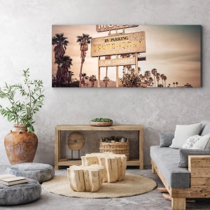 Le tableau « Motel rétro au soleil » illustre le charme de l'Amérique d'antan dans un style vintage. L'élément central de cette composition est une enseigne de motel rétro, entourée de palmiers élancés, qui confèrent à la scène un caractère exotique.
