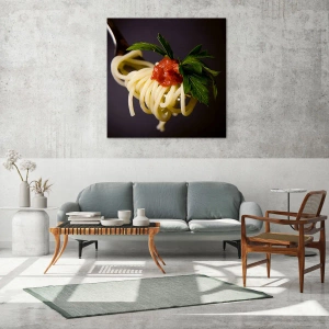 Impression sur verre - Image sur verre - Spaghettis à la fourchette avec sauce tomate - 70x50cm - Une bouchée savoureuse - Décoration murale moderne pour le salon et la chambre ARTTOR