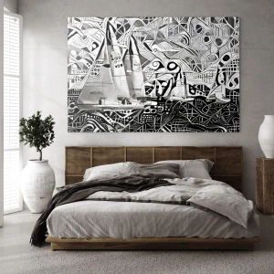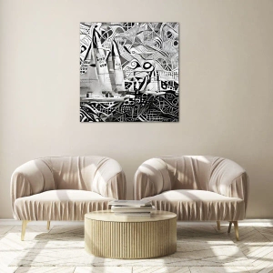 La peinture sur verre est faite sur un verre de 4 mm d'épaisseur. Les bords du verre ont une arête trapézoïdale mate. La tableau est sûr à l'utilisation et prêt à être accroché - il a des crochets en métal attachés à l'arrière du cadre et des entretoises en mousse permettant la régulation uniforme de la distance du tableau au mur.