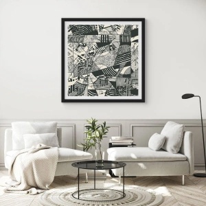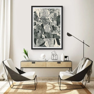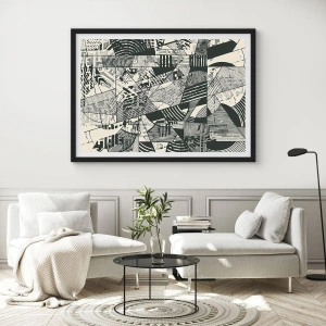 - Cette affiche présente des motifs géométriques abstraits en noir et blanc. Parfaite pour les intérieurs modernes et minimalistes. L'ensemble comprend un cadre noir de 50 x 70 cm.