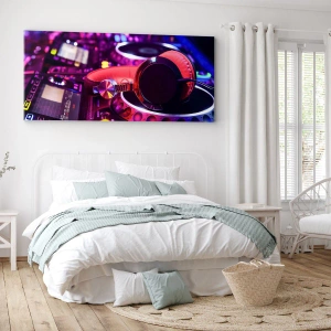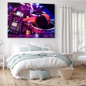 Impression sur toile - Image sur toile - Casque DJ sur une console avec éclairage néon - 50x70cm - Avant que le plaisir ne commence - Décoration murale moderne pour le salon et la chambre ARTTOR