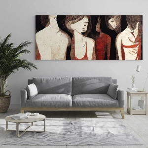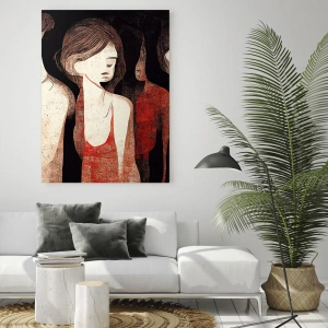Les contrastes dominent le tableau : les contours délicats des corps sont juxtaposés à un rouge intense et un noir profond. Les figures sont présentées de manière simplifiée, avec une absence volontaire de détails faciaux, leur conférant anonymat et universalité. Le rouge symbolise l'émotion, la passion et la corporalité, tandis que le noir ajoute mystère et réflexion. Les femmes semblent à la fois présentes et insaisissables, présentes dans l'espace et pourtant intérieurement fermées. La disposition des figures crée un récit qui peut être interprété comme un dialogue entre différents aspects de la psyché féminine ou comme un cycle émotionnel. Chaque personnage a une posture et une inclinaison de la tête différentes, témoignant de l'individualité et de la multidimensionnalité de la scène représentée. Malgré sa simplicité, le tableau transmet un message puissant : il s'agit d'une œuvre sur l'intimité, l'identité féminine et le monde émotionnel. C'est une métaphore visuelle des expériences, de la solitude, de la force et de la sensibilité. Le tableau ne raconte pas une histoire unique ; chaque spectateur peut l'interpréter différemment, à la recherche de ses propres émotions et significations. La composition évoque une scène de théâtre, où chaque personnage joue un rôle symbolique, pensif, inexploré jusqu'au bout. Le style artistique rappelle la gravure sur bois ou l'estampe, soulignant son caractère et l'éloignant du réalisme classique. Le tableau aborde les questions d'identité, de complexité psychologique et d'expérience féminine. Il peut également symboliser le silence, la douleur cachée ou la force intérieure. Cette peinture sur verre d'ARTTOR, au format horizontal de 70 x 50 cm, a été réalisée avec le plus grand souci du détail. La technologie d'impression sur verre permet d'obtenir une profondeur de couleur, une clarté et une intensité de détail. Les noirs deviennent plus veloutés et les rouges plus saturés. La surface lisse et brillante du verre apporte élégance et modernité à la composition. Durable, résistante aux UV et facile à nettoyer, cette peinture est parfaite pour les intérieurs comme pour les espaces publics. La technologie permet de capturer chaque ligne et chaque nuance de texture, conférant à l'œuvre le caractère d'une galerie d'art. Le verre sublime le message, ajoute de la profondeur au symbolisme et souligne l'intensité des émotions capturées dans la composition.