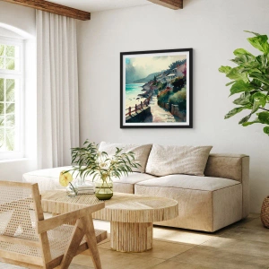 Affiche dans un cadre noir - Poster - Un sentier pittoresque en bord de mer dans un style aquarelle - 50x70cm - Ville méditerranéenne - Décoration murale moderne pour le salon et la chambre ARTTOR