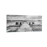 Impression sur verre - Image sur verre - Une vue en noir et blanc d'une jetée en bois sur une mer agitée. - 120x50cm - J'attends que le vent, ça le chassera... - Décoration murale moderne pour le salon et la chambre ARTTOR