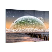 Impression sur verre - Image sur verre - Un paysage fantastique avec la mer et une planète - 120x80cm - Paysage surréaliste - unité de la nature - Décoration murale moderne pour le salon et la chambre ARTTOR