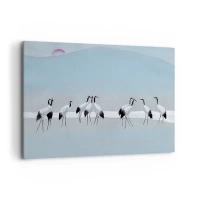 Impression sur toile - Image sur toile - Un groupe de grues contre un ciel bleu et le soleil levant - 120x80cm - Après une chaude journée - Décoration murale moderne pour le salon et la chambre ARTTOR