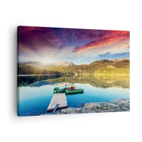 Impression sur toile - Image sur toile - Trois bateaux en bois sur fond de lac de montagne au coucher du soleil - 70x50cm - Rien contre nature - Décoration murale moderne pour le salon et la chambre ARTTOR