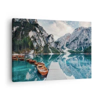 Impression sur toile - Image sur toile - Un lac avec des bateaux entouré de montagnes - 70x50cm - On va te montrer la beauté - Décoration murale moderne pour le salon et la chambre ARTTOR