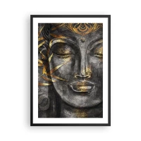 Affiche dans un cadre noir - Poster - Portrait de Bouddha avec une lueur dorée et des éléments de feuille de bambou - 50x70cm - Ressentir le calme - Décoration murale moderne pour le salon et la chambre ARTTOR