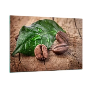 Impression sur verre - Image sur verre - Grains de café sur fond de feuilles et de bois - 120x80cm - La plus vraie et noire - Décoration murale moderne pour le salon et la chambre ARTTOR