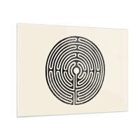 Impression sur verre - Image sur verre - Un labyrinthe noir et blanc de forme circulaire sur fond clair. - 70x50cm - Ordre mystérieux - Décoration murale moderne pour le salon et la chambre ARTTOR