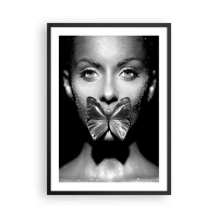 Affiche dans un cadre noir - Poster - Portrait d'une femme avec un papillon sur les lèvres en noir et blanc - 50x70cm - Baiser papillon - Décoration murale moderne pour le salon et la chambre ARTTOR