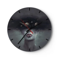Horloge murale - Pendule murale - Une composition cosmique de planètes dans la tête d'une femme sur un fond sombre. - 30x30cm - Et les planètes deviennent folles... - Décoration murale moderne pour le salon, la cuisine et la chambre ARTTOR