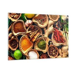 Impression sur verre - Image sur verre - Épices colorées dans des contenants naturels avec additifs - 120x80cm - Prends ce que tu veux - Décoration murale moderne pour le salon et la chambre ARTTOR