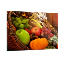 Impression sur verre - Image sur verre - Un panier rempli de fruits et légumes dans un arrangement d'automne - 120x80cm - Panier de récolte - Décoration murale moderne pour le salon et la chambre ARTTOR