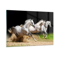 Impression sur verre - Image sur verre - Trois chevaux blancs galopant sur le sol sablonneux - 120x80cm - Trois Grâces - Décoration murale moderne pour le salon et la chambre ARTTOR