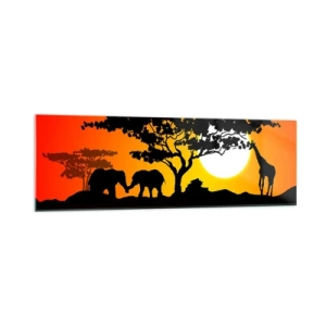 Impression sur verre - Image sur verre - Coucher de soleil africain avec des silhouettes d'éléphants et de girafes au-dessus de l'eau - 160x50cm - Rencontre dans la savane - Décoration murale moderne pour le salon et la chambre ARTTOR