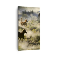 Impression sur toile - Image sur toile - Un troupeau de chevaux sauvages galopant à travers la poussière et la végétation - 80x120cm - Rivalité - liberté ou force masculine ? - Décoration murale moderne pour le salon et la chambre ARTTOR