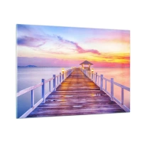 Impression sur verre - Image sur verre - Jetée en bois au coucher du soleil sur une mer calme - 100x70cm - Le silence lilas-doré du soir - Décoration murale moderne pour le salon et la chambre ARTTOR